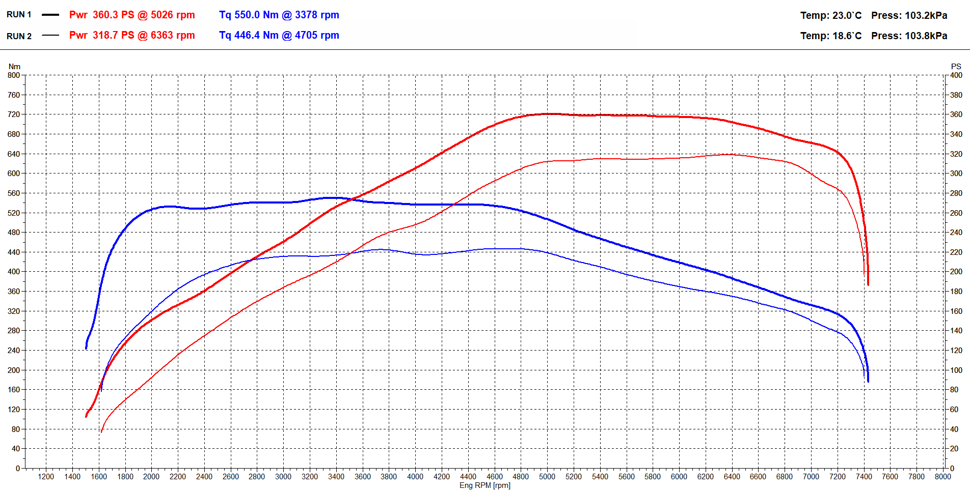 Tuned file: +42 PS, +104 Nm, VMAX increased.